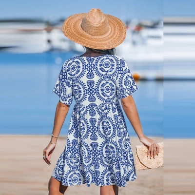 Effortlessly stylish and breezy, this boho-inspired dress features an allover blue and white medallion print on a lightweight, flowy fabric. The relaxed silhouette with short sleeves and a V-neckline offers a flattering, comfortable fit perfect for warm-weather adventures. Pair it with sandals and a floppy hat for a chic beach look.Product code: CAA05A4M019CT