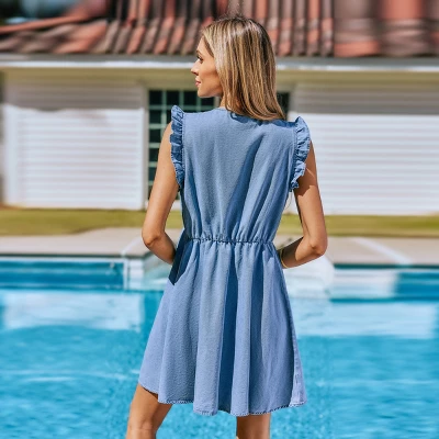 Effortlessly chic and perfect for warm weather, this denim dress features a flattering plunging v-neckline and ruffle details along the shoulders. The lightweight denim fabric drapes beautifully, while the elastic waistband ensures a comfortable fit. Pair it with sandals and a straw bag for a stylish beach or resort look.Product code: CAA05A5D081TT