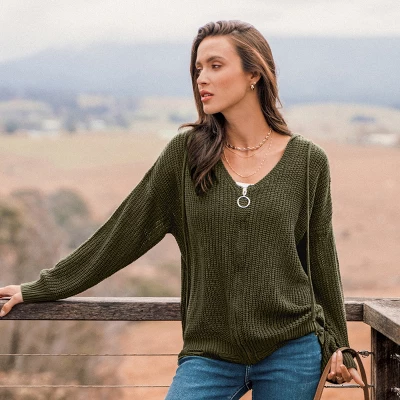 Revamp your winter style with our Distressed Crochet Olive Green O-Ring Sweater. This cozy knit blends edgy distressing with delicate crochet details and an eye-catching O-ring accent, making it a must-have for those who embrace both warmth and fashion.Product code: CAA06A3H002HGModel Wearing Size: SHeight: 5’6′ in168 cmBust: 33.1 in84 cmWaist: 25.2 in64 cmHips: 34.6 in 88 cm