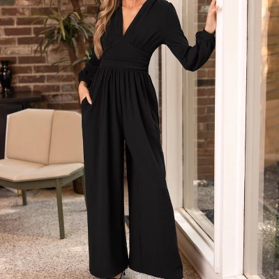 Exude effortless sophistication in this chic black jumpsuit. The wrap-style bodice flatters your figure, while the wide-leg pants create a sleek, elongated silhouette. Crafted from a lightweight, breathable fabric, this versatile piece is perfect for any occasion, from casual outings to formal events. Pair it with heels and statement jewelry for a glamorous evening look or dress it down with sandals for a stylish daytime ensemble.Product code: CAA13E4L003RR