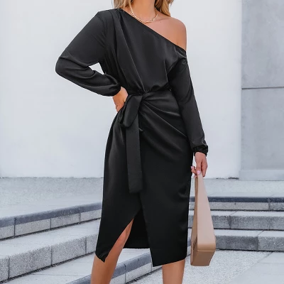 Exude sophistication in this stunning one-shoulder satin wrap dress. Crafted from satin fabric, it features a flattering wrap design with a tie belt that cinches the waist, creating a feminine silhouette. The one-shoulder neckline adds a touch of allure, while the midi length and side slit provide a chic and modern look. Perfect for evening events or date nights, this dress is a versatile and stylish choice.Product code: CAA05A4J038AA