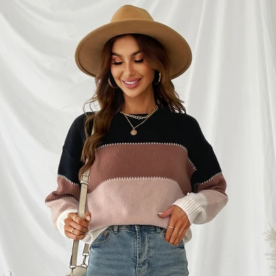 Mix up your off-duty look with this knit sweater featuring a classic striped pattern, colorblock design, round neckline, long sleeves, and ribbed trim. Complete the look with a pair of high-rise jeans and sneakers. Step into this fall and winter sweater and embrace its versatile charm, perfect for any occasion where you want to radiate elegance and confidence.Product Code: CAA06A2H002AJ/CAA06A2H002HA/CAA06A2H002TS